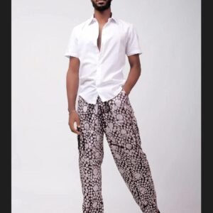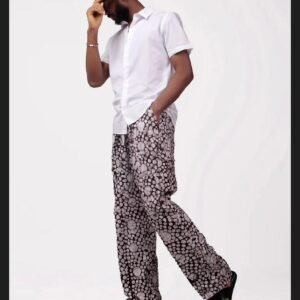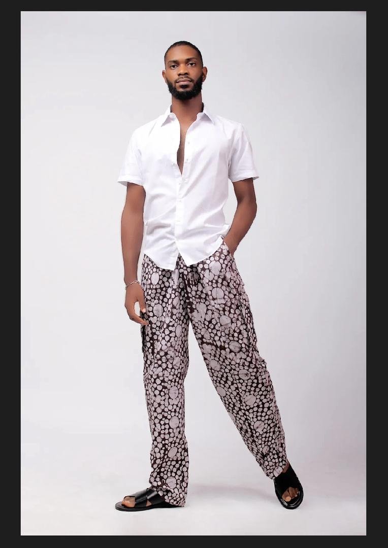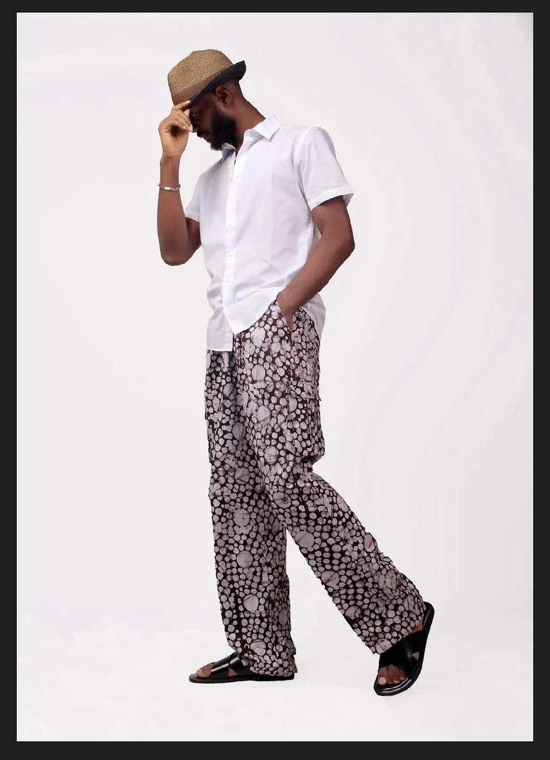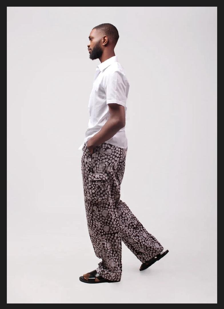 Unisex cargo pants feature a side pocket made with hand-dyed Adire cotton.