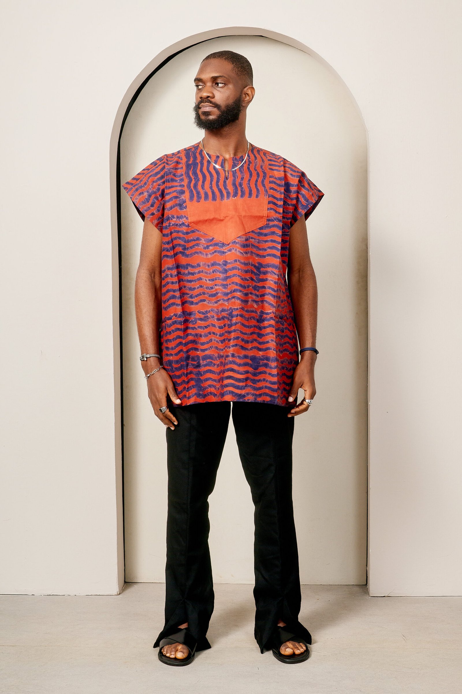 Unisex danshiki offers relaxed comfort, made from hand-dyed Adire cotton.